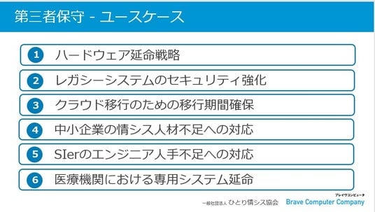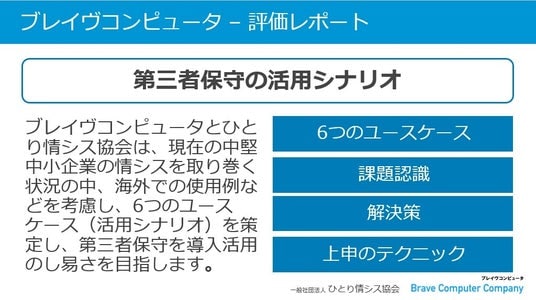 「つなぎ保守」は協会の推奨ソリューションへ ブレイヴコンピュータ株式会社(本社:東京都千代田区、代表取締役社長:神山悟)は、一般社団法人ひとり情シス協会(事務局:清水 博、所在地:東京都千代田区)と提携して、企業が直面するITインフラの保守終了問題に対する実践的な解決策として第三者保守サービスの戦略的活用方法をまとめた「第三者保守の活用シナリオ」を公開いたしました。