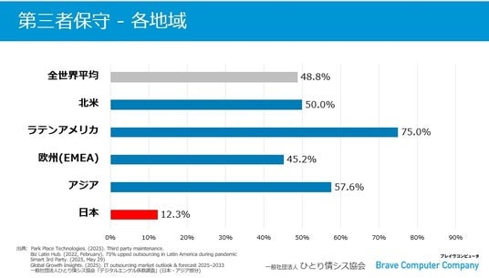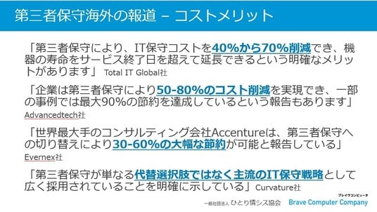 第三者保守は、海外では主流のIT戦略として認知されており、50~80%のコスト削減を実現しています。日本国内でも2020年3月にデジタル庁の「デジタル社会推進標準ガイドライン実践ガイドブック」に、第三者保守の事例が紹介されて5年経過し徐々に利用は拡大していますが、今なお、日本国内の第三者保守の普及率は12.3%であり、欧米諸国と比べて低い水準です。そこでブレイヴコンピュータは、第三者保守の活用促進のため、中堅中小企業の情シス担当者の支援活動をしている、ひとり情シス協会と提携して「第三者保守の活用シナリオ」を公開しました。