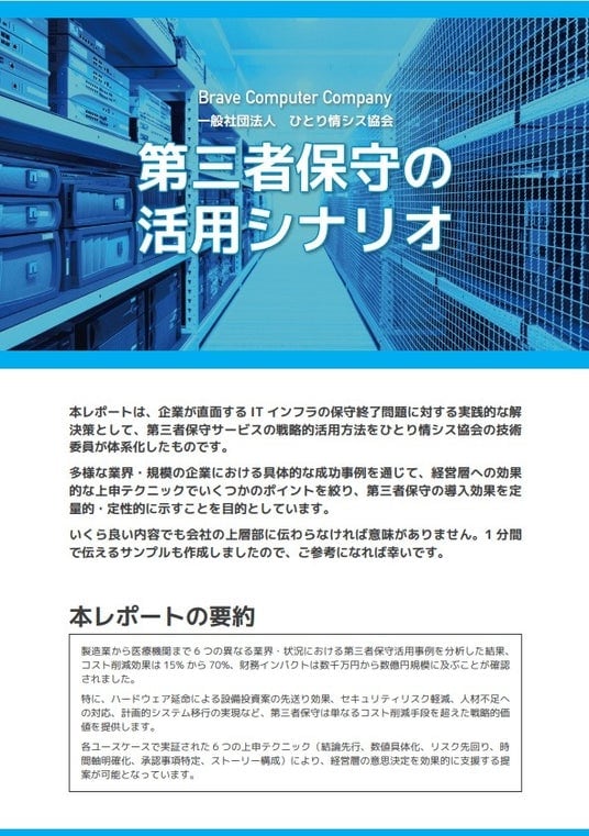 本レポートは、第三者保守の戦略的活用方法をひとり情シス協会の技術委員が体系化したものです。多様な業界・規模の企業における具体的な成功事例を通じて、経営層への効果的な上申テクニックでいくつかのポイントを絞り、第三者保守の導入効果を定量的・定性的に示すことを目的としています。