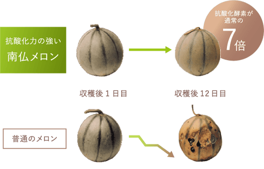 このメロンは収穫後も長期間鮮度を保つ特性があり、通常のメロンの7倍以上の抗酸化酵素を含むことが知られています。さらに、そのメロン抽出物をグリソディンに進化させる技術が注目されています。