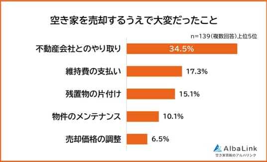「空き家を売却するうえで大変だったこと」を聞いたところ、1位は「不動産会社とのやり取り(34.5%)」でした。2位「維持費の支払い(17.3%)」、3位「残置物の片付け(15.1%)」が続きます。