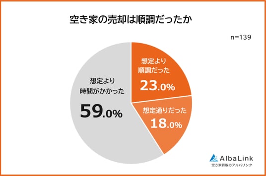 「空き家の売却が順調だったか」という問いには、「想定より順調だった(23.0%)」「想定通りだった(18.0%)」と答えた人が合わせて41.0%でした。順調だと感じた人は4割を超えてはいるものの、苦戦した(している)人のほうが優勢です。