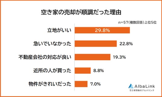 空き家の売却が順調だった理由として最も多かった回答は、「立地がいい(29.8%)」でした。物件そのものが魅力的だと、売れやすくなることが明らかです。
