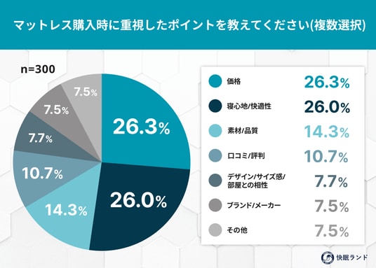 - マットレスの価格帯は「1~3万円未満」が41.0%と最多- マットレス購入時のポイントは「寝心地・快適性」(26.0%)と「価格」(26.3%)が上位