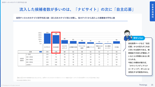 sonar ATSに登録された採用チャネル(候補者の流入元)を9つのカテゴリに集計し、カテゴリ別の平均流入数を算出したところ、「ナビサイト」に次いで「自主応募」からの流入が多いことがわかりました。