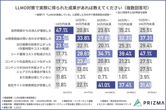 成果実感は金額が上がるほど「リード獲得コスト削減」「検索順位改善」が上位──LLMOの定着が進む