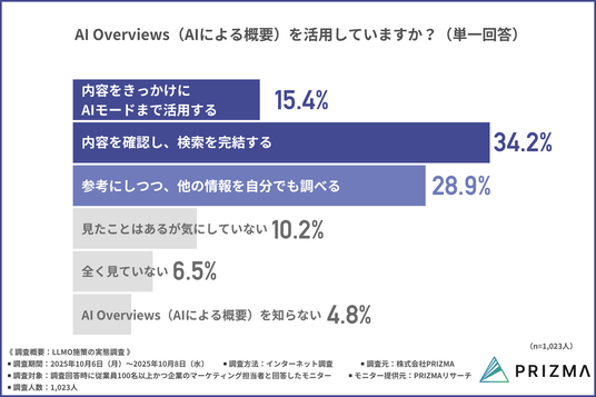 結果は、「内容を確認し、検索を完結する(34.2%)」が最多で、「参考にしつつ、他の情報を自分でも調べる(28.9%)」「内容をきっかけにAIモードまで活用する(15.4%)」と続きました。