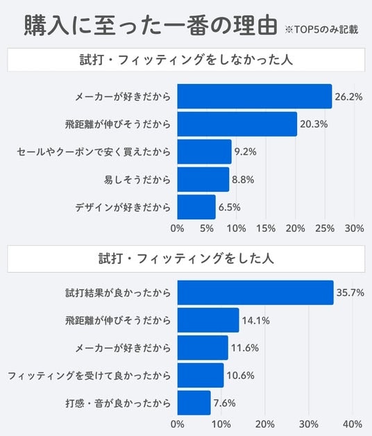 購入に至った一番の理由をたずねたところ、試打・フィッティングをしなかった人の回答は「メーカーが好きだから」(26.2%)が最多で、試打・フィッティングをした人たちからの同じ回答の実数を凌駕。一方、「セールやクーポンで安く買えた」「易しそう」「デザインが好き」という特定メーカーにはこだわらない購買動機を挙げる回答も目立ち、必ずしも指名買いが多いとは言えない傾向を示しました。なお、試打・フィッティングをした人の第1位は「試打結果が良かったから」(35.7%)でした。