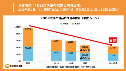 10月は食品ロス削減月間として、全国で取り組みが呼びかけられています。「頂き物の野菜が多すぎて困る」「家族の予定が合わず、買った野菜が冷蔵庫で眠っている」「キャベツを1玉買ったら使い切れない」──こうした"食べきれない現実"は、多くの家庭が直面する切実な課題です。日本では年間464万トンの食品ロスが発生しており、家庭からの食品ロスは半分近くを占めます。2000年と比べると全体で53%削減と進展していますが、事業系58%削減に対し、家庭系は46%削減にとどまっています(※3)。