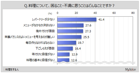 料理をする人に、料理についての困りごと・不満に思うことを聞いたところ(複数回答)、「レパートリーが少ない」が41.4%、「メニューがなかなか決まらない」「後片付けが面倒」が各3割弱、「栄養バランスのよいメニューを考えるのが難しい」が25.5%となっています。