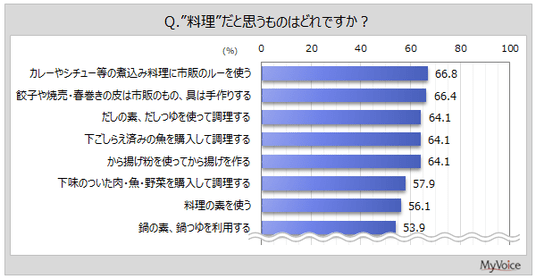 “料理”だと思うものを聞いたところ(複数回答)、上位には「カレーやシチュー等の煮込み料理に市販のルーを使う」「餃子や焼売、春巻きは、皮は市販のものを使い具は手作りする」「だしの素、だしつゆを使って調理する」「下ごしらえ済みの魚を購入して調理する」「から揚げ粉を使ってから揚げを作る」が各60%台であがっています。