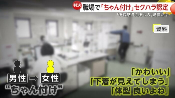 判決によると、男性は職場で女性を日常的に「ちゃん」付けで呼び、「かわいい」「下着が見えてしまう」「体形いいよね」などと話しかけていたという。