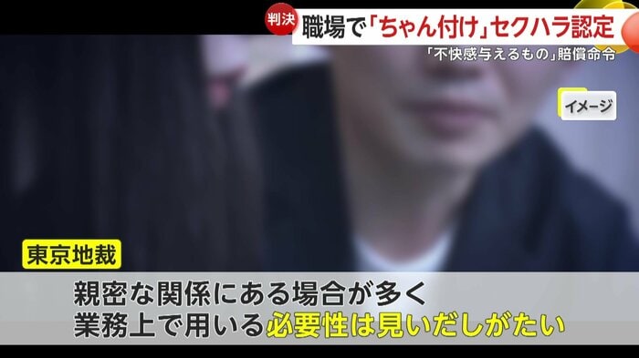 東京地裁は23日の判決で、「ちゃん」付けについて「一般的には幼い子供に対して用いられ、成人に対して使うのは交際相手などの親密な関係にある場合が多く、業務上で用いる必要性は見いだしがたい」と、「ちゃん」付けは不快感を与えるものだったとして、一連の発言を含めてセクハラに当たると認定し、男性に22万円の賠償を命じた。
