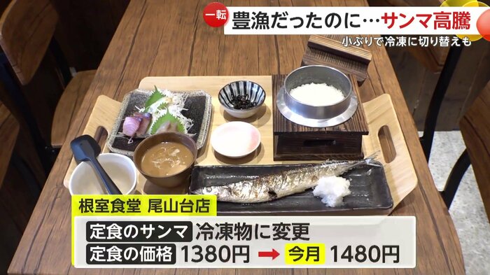 「根室食堂 尾山台店」では、定食に使うサンマを冷凍物に変更し、価格も10月から100円値上げした。