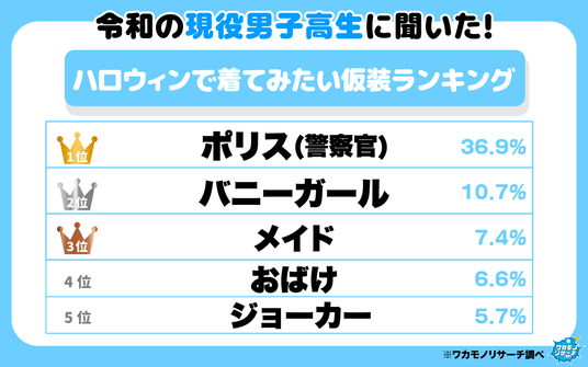 男子高生にも「どんな仮装をしてみたいか?」というアンケート調査を実施し、その結果をランキングにしたところ、