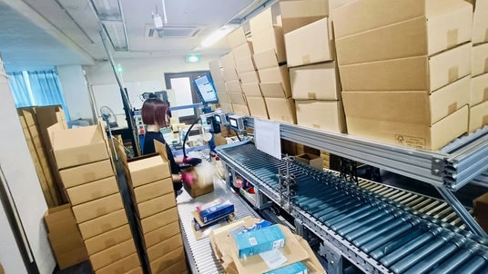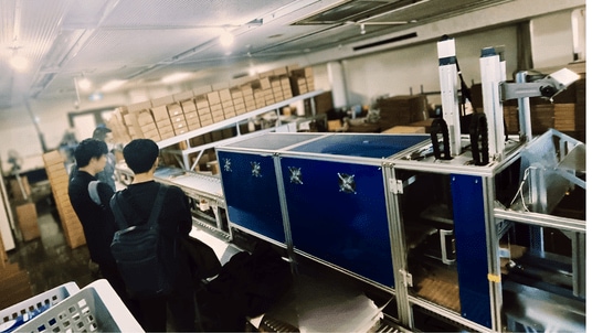 作業者は流れてきた商品を箱に詰めバーコードを読むだけで、自動的に封緘し送り状を貼ってくれるシステムを構築。