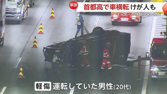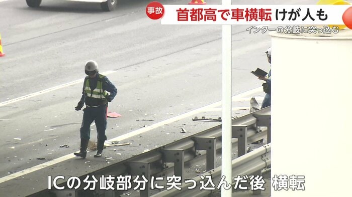 警視庁によると、ワゴン車が近くのインターチェンジの分岐部分に突っ込んだ後、横転したという。