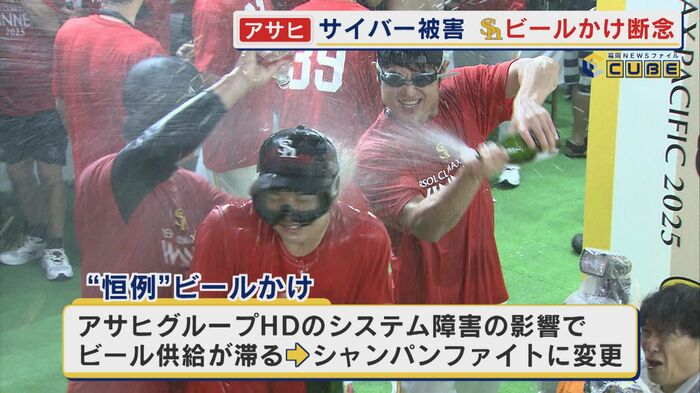 2025年10月20日の夜、選手たちが手に持っているのはビールではなくシャンパンだ。アサヒグループホールディングスへのサイバー攻撃によるシステム障害の影響で、ビールの供給が滞っていることから恒例の“ビールかけ”は取り止めとなり“シャンパンファイト”に切り替えて、喜びを分かち合った。