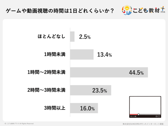 - ゲーム・動画の視聴時間、84.0%が「1日1時間以上」と回答。最多は「1時間~2時間未満」(44.5%)