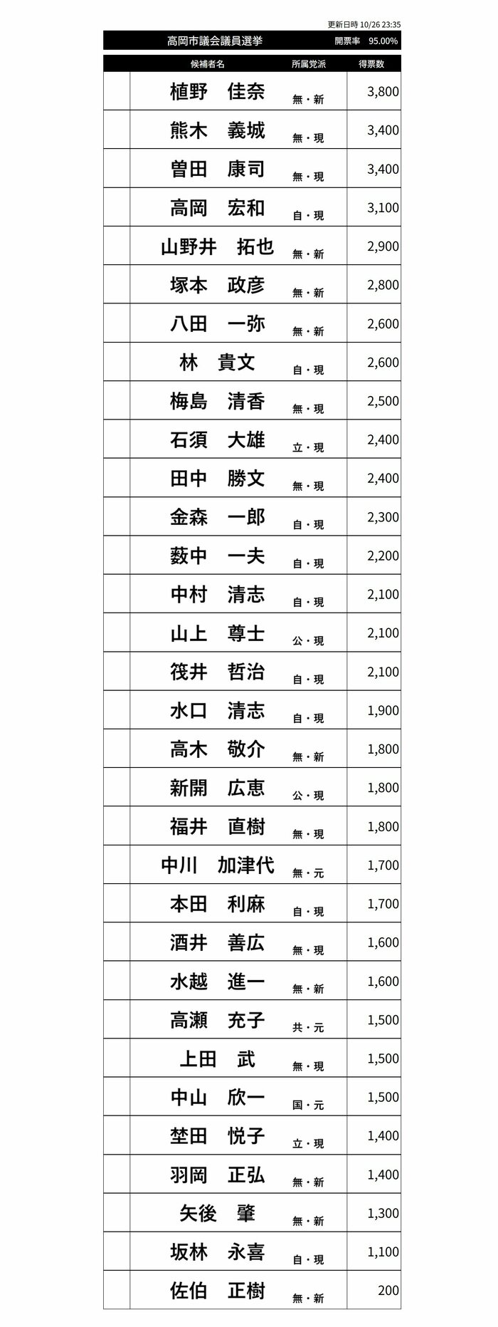 高岡市議会議員選挙、午後11時半発表の開票速報です。