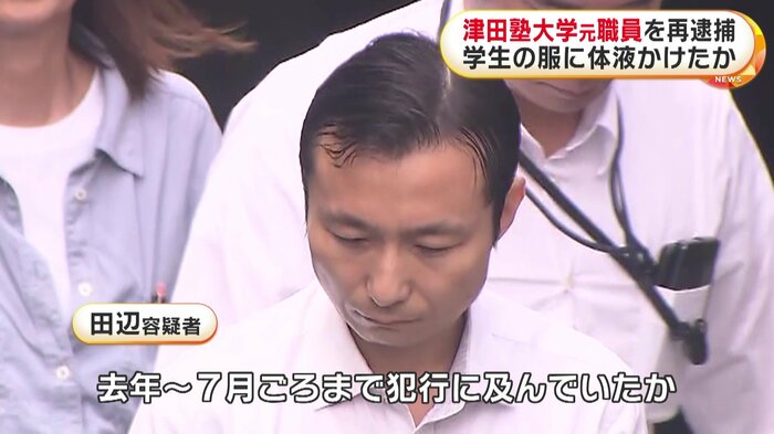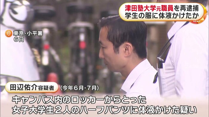 捜査関係者によりますと、津田塾大学の元職員・田辺佑介容疑者(43)は2025年6月と7月に、東京・小平市にあるキャンパス内のロッカーからとった女子大学生2人のハーフパンツに体液をかけた器物破損の疑いが持たれている。