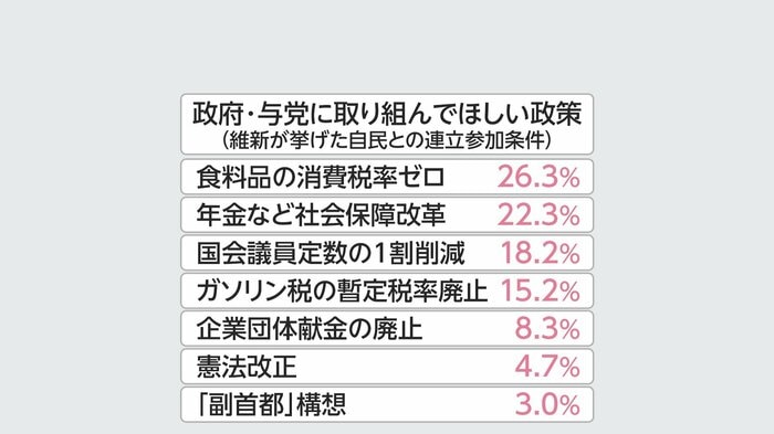 【問11】 日本維新の会が連立政権参加の条件として挙げた政策のうち、政府・与党に最優先で取り組んでほしい政策はどれか。