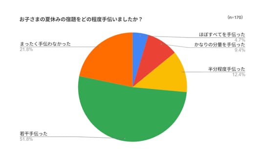 お子さんがどの程度宿題を管理できていたのか訊いてみると、4割以上の方が「宿題の内容は把握していたが、進捗は管理できなかった」と回答し、「自分で進捗管理ができていた」と回答された方より10%程多い結果になりました。お子さんの年齢にもよりますが、多種多様な宿題を、夏休み中にお子さん一人でやり遂げるのはなかなか難しいようです。そこで必要になってくるのが保護者の方のサポート。ヨメルバ会員の皆さんは、どのくらい、どのようにお子さんの宿題を手伝ったのでしょうか。