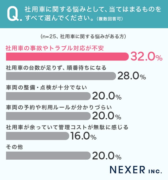 社用車に関する悩みとして、当てはまるものをすべて選んでもらいました。
