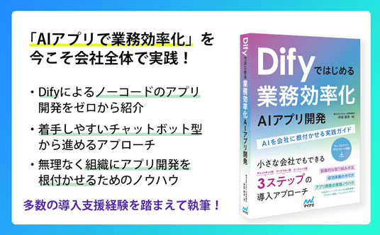 弊社代表 岸田 崇史(きしだ たかし)の執筆による「Difyではじめる 業務効率化AIアプリ開発~AIを会社に根付かせる実践ガイド」がマイナビ出版より本日発売されました。