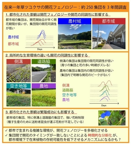 本研究の結果は、都市環境下で生まれる多様な局所的環境(側溝の中や公園、残存する農地等)に応じた開花タイミングの多様化を通して集団間の開花タイミングにズレが生じる“時間的な分断化”が、植物の繁殖成功や存続可能性に影響しうることを示唆する初めての報告です。本研究成果は、自然と調和した持続可能な都市生態系の構築のための重要な知見となることが期待されます。