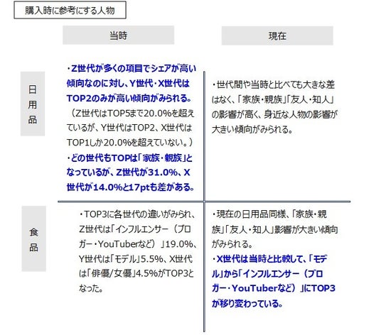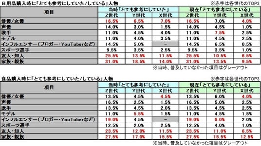また、Z世代に関して、日用品は「俳優/女優」がTOP3、食品は「インフルエンサー(ブロガー・YouTuberなど)」TOP3で、購入するもので参考にしている人物が異なっていた。