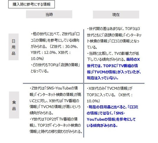 また、日用品はX世代含め、TVからネットの情報に移行しているが、X世代は食品購入時、TVCMの情報を参考している結果となった。