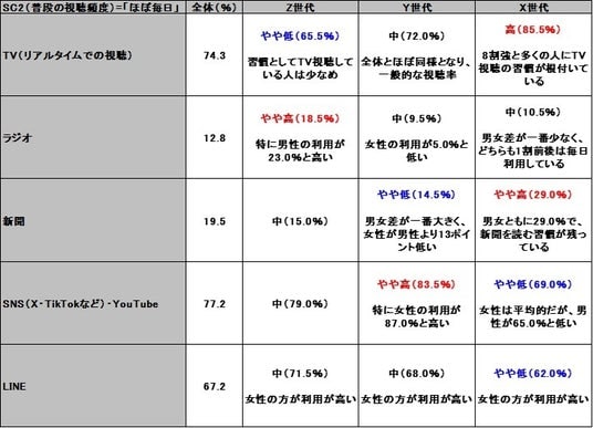 TVをほぼ毎日視聴する割合、全体の74.3%に対して、Z世代65.5%、Y世代72.0%、Z世代85.5%。