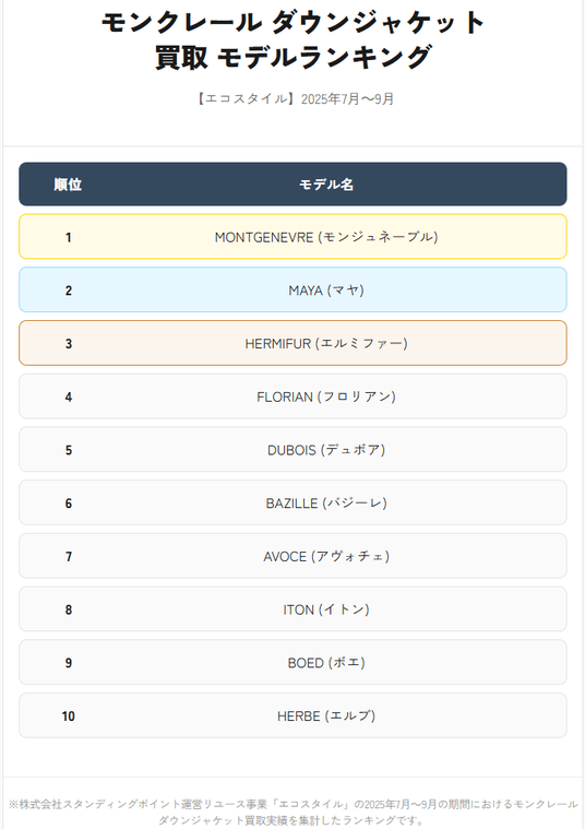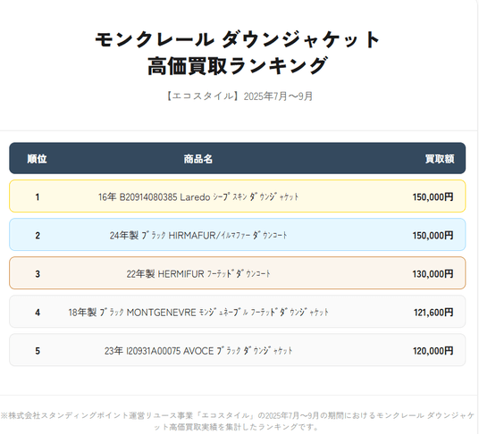 株式会社スタンディングポイント(本社:東京都目黒区、代表取締役:若森 寛、以下「スタンディングポイント」)が運営するファッションリユース事業「ECOSTYLE(エコスタイル、https://www.style-eco.com/)」は、エコスタイルにおける2025年7月~9月のモンクレール(MONCLER)のダウンジャケットモデル別買取ランキングを発表します。