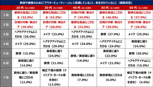2.アウタービューティーは世代問わず「基礎化粧品にこだわる」「日焼け対策・美白ケア」が上位に