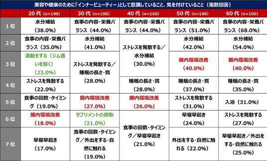 実践している人がより多かったインナービューティー。20代においての1位は「水分補給(38.0%)」、60代においての1位は「食事の内容・栄養バランス(68.0%)」でした。20代では「運動をする(ジム通いを除く)(23.0%)」、30代では「サプリメントの摂取(21.0%)」が他の世代と比べて上位にランクイン。「腸内環境改善」は、年齢層が上がるほどランキングも上がるという傾向が見えました。