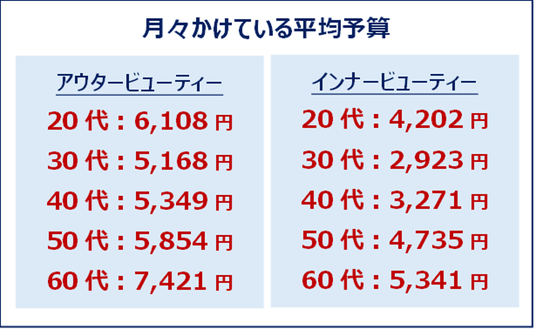 アウタービューティーとインナービューティーそれぞれに月々かけている金額を聞いたところ、平均金額はどの年齢層でも1,000円~2,200円ほどアウタービューティーの方が高い結果となりました。インナービューティーは、栄養バランスや生活習慣など、お金をかけずに意識できることも多い中でも、各世代一定の金額を使っているようです。また、若い世代である20代が、50代・60代に次ぐ平均金額となり、メイクやスキンケアといったアウタービューティーだけでなく、内側から美しくなるインナービューティーにも注目し、ある程度お金をかけていることが分かります。
