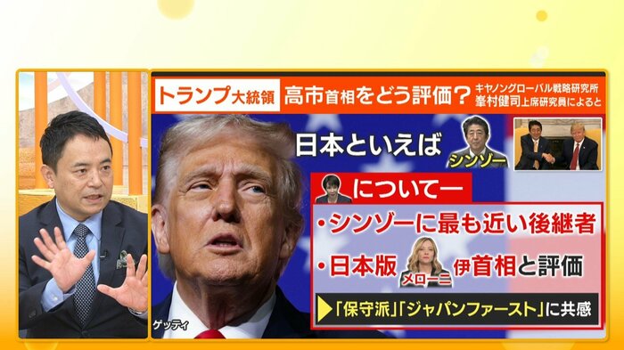 私、高市さんとイベントなどでご一緒することが多いのですが、そのときに思うのはものすごく権威の方であっても初対面の方でもすごくチャーミングにふところに入るのがうまい方で。コミュニケーション能力がとても高い方、なおかつただ迎合するのではなくきっちり自分のパッションを持ちながら対応する方でもあるので、今回のトランプさんとの対談においてもものすごく良い形でコミュニケーションが取れるのではないかと期待していますね。