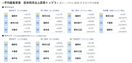 <2025年9月 全国主要都市における賃貸マンション・アパートの平均家賃(面積帯別)>