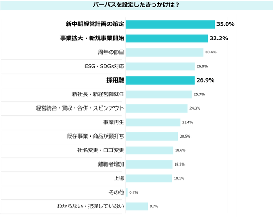 パーパスを設定するきっかけの上位は、「新中期経営計画の策定」や「事業拡大・新規事業開始」という企業の大きな節目ですが、「採用難」をきっかけとしてパーパスを設定する企業が27%いることもわかりました。