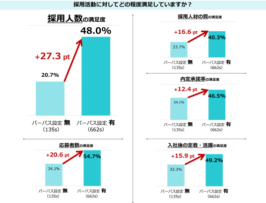 このようにパーパス設定の有無が採用人数や採用人材の質などの満足度向上に寄与していることが明らかになりました。
