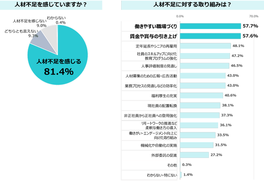 まず、調査によると、現在8割以上の企業が人材不足を感じており、人材不足に対して、「働きやすい職場づくり」や「賃金や賞与の引き上げ」などの取り組みを積極的に行っている様子がうかがえます。