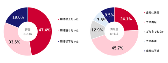 来場者の評価は総じて高く、「期待以上」47.4%、「期待通り」33.6%だった。合わせると約8割が肯定的に評価していた。満足度は「非常に満足」24.1%、「やや満足」45.7%で合わせると70%近かった。