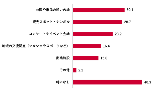 万博閉幕後の「大屋根リング」などの施設をどのように活用するとよいか聴取したところ、「公園や市民の憩いの場」(30.1%)、「観光スポット・シンボル」(28.7%)が上位だった。一方で、「特になし」が40.3%となった。