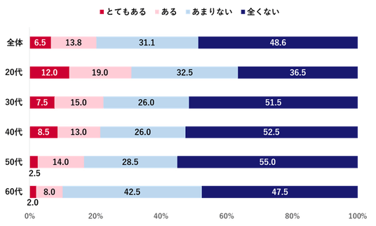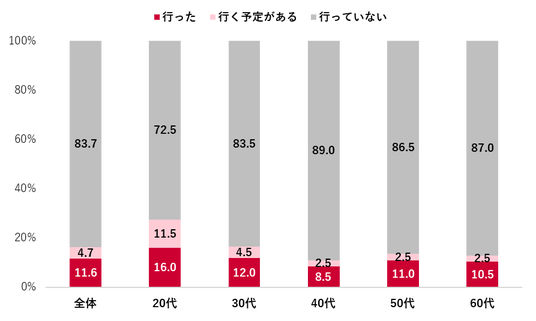 年代別で見ると、20代では「行った」が16.0%、「行く予定がある」が11.5%と、他の年代よりも高かった。