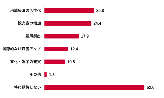 IRの開業による効果として「地域経済の活性化」(25.8%)や「観光客の増加」(24.4%)を期待する一方で、「特に期待しない」が52.0%だった。