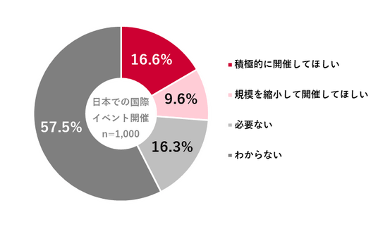 今後、日本で万博や五輪などの国際イベントを開催することについて、「積極的に開催してほしい」と回答した人は16.6%にとどまった。また、「わからない」が57.5%と多数を占めた。