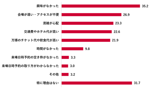 大阪・関西万博に「行っていない」(83.7%)と回答した方を対象に、行かなかった理由を伺ったところ、「興味がなかった」(35.2%)がトップ、次いで「会場が遠い・アクセスが不便」(26.9%)だった。「特に理由はない」との回答が31.7%だった。