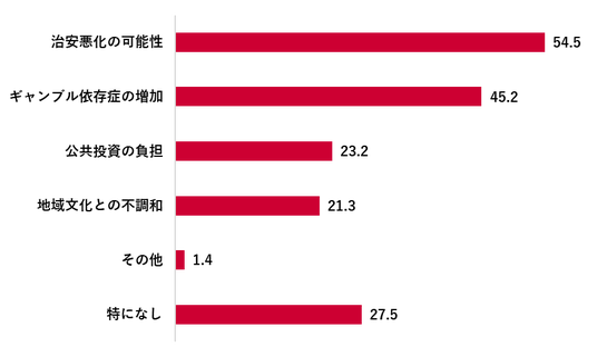 懸念点については「治安悪化の可能性」(54.5%)、「ギャンブル依存症の増加」(45.2%)が上位となり、安全や社会的影響への不安がうかがえる。