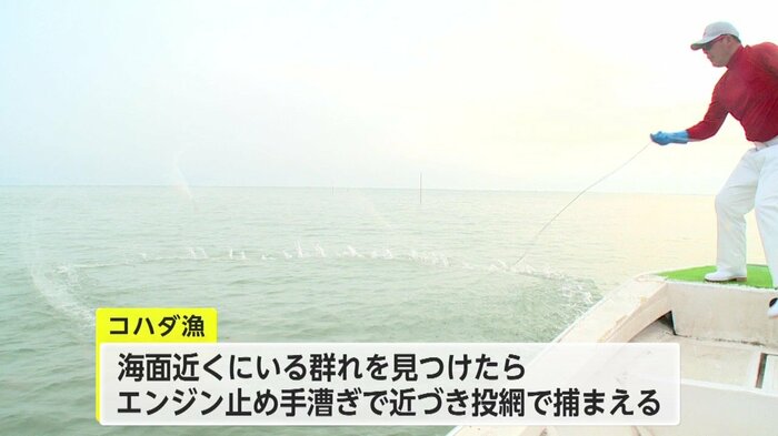 コハダは警戒心が強く、音に敏感な魚。このため、海面近くにいる群れを見つけたら船のエンジンを止めて手漕ぎで近づき、投網で捕らえる。